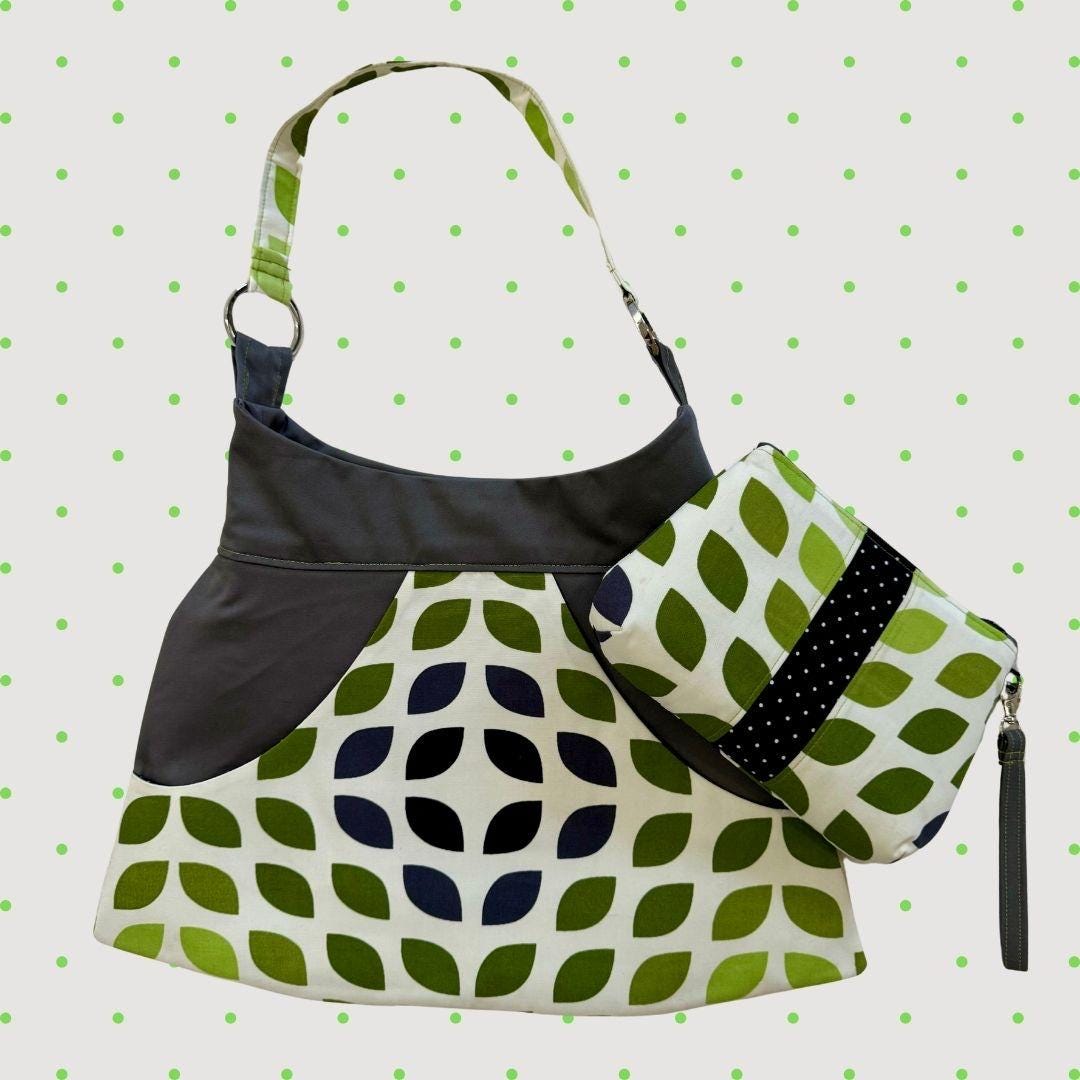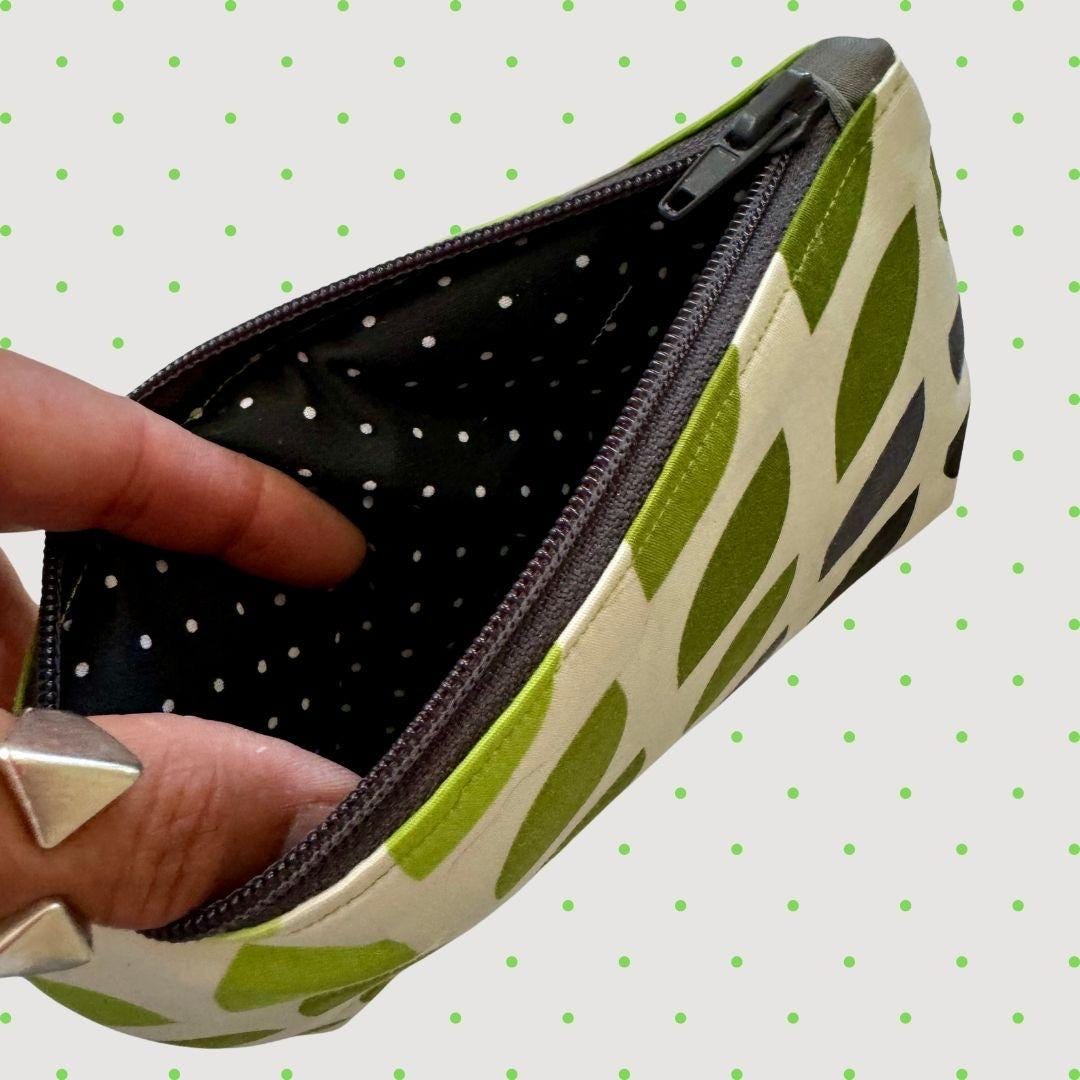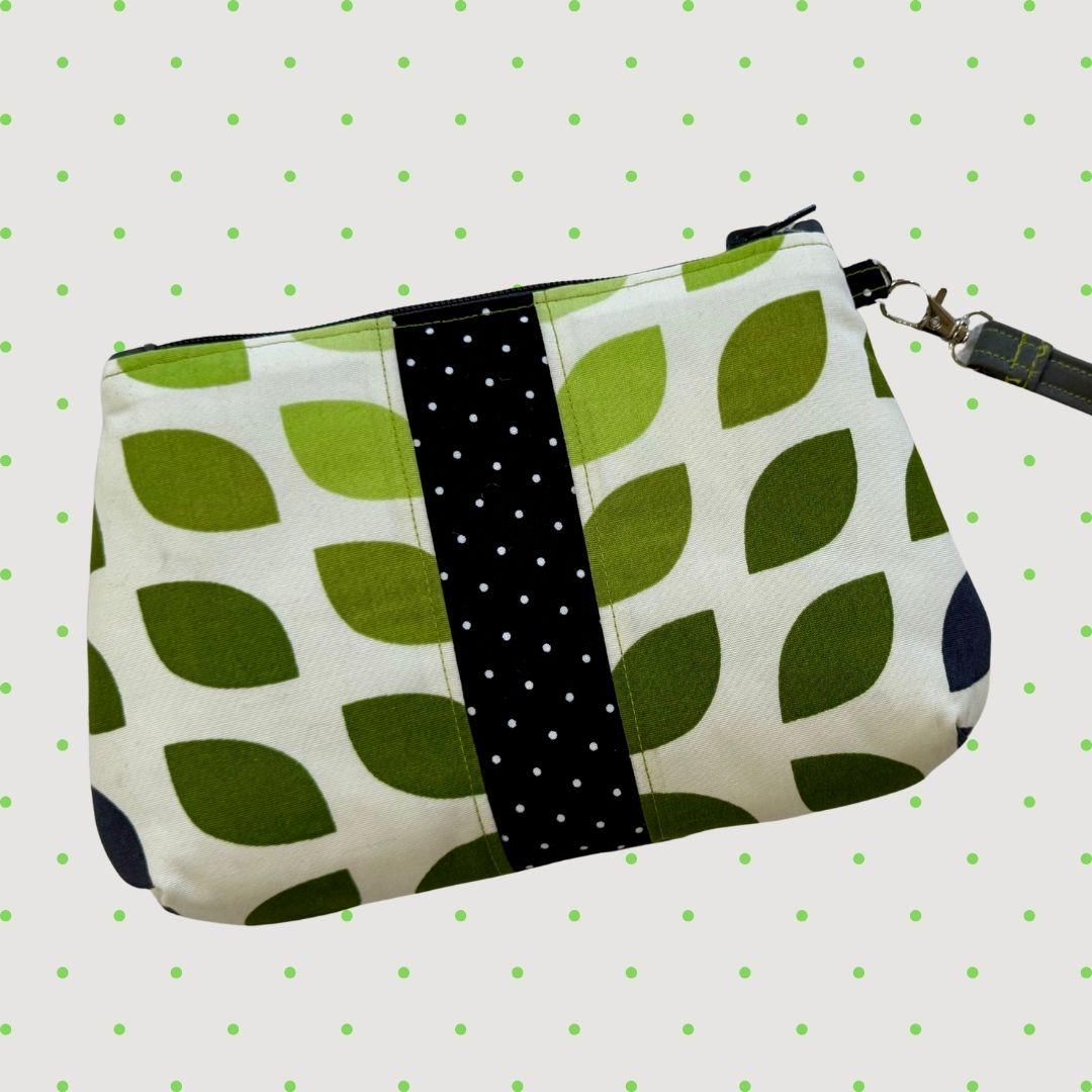 Green Geometric Wristlet : Large This quilted zipper pouch / wristlet with handle is made of cotton / Poly Blend and lined with a black and white polka dot fabric. The bag is a great addition to any existing tote or as a stand alone handy wristlet. It fit’s most cell phones and a small wallet, makeup, whatever floats your boat really. The bag is padded for extra protection and to create some structure. It’s a cute little number and a great gift. The handle is detachable and it closes with. zipper.