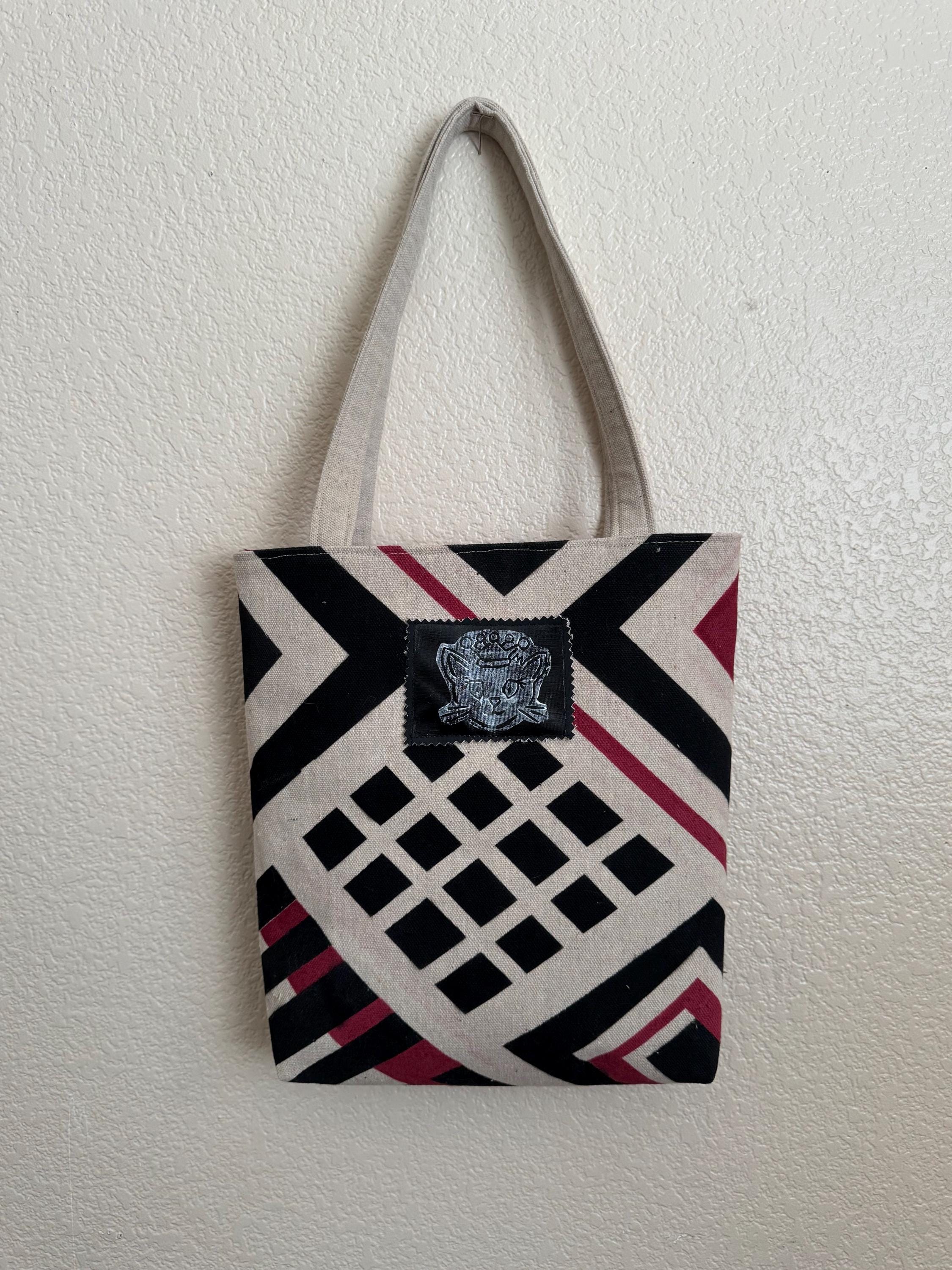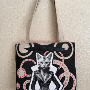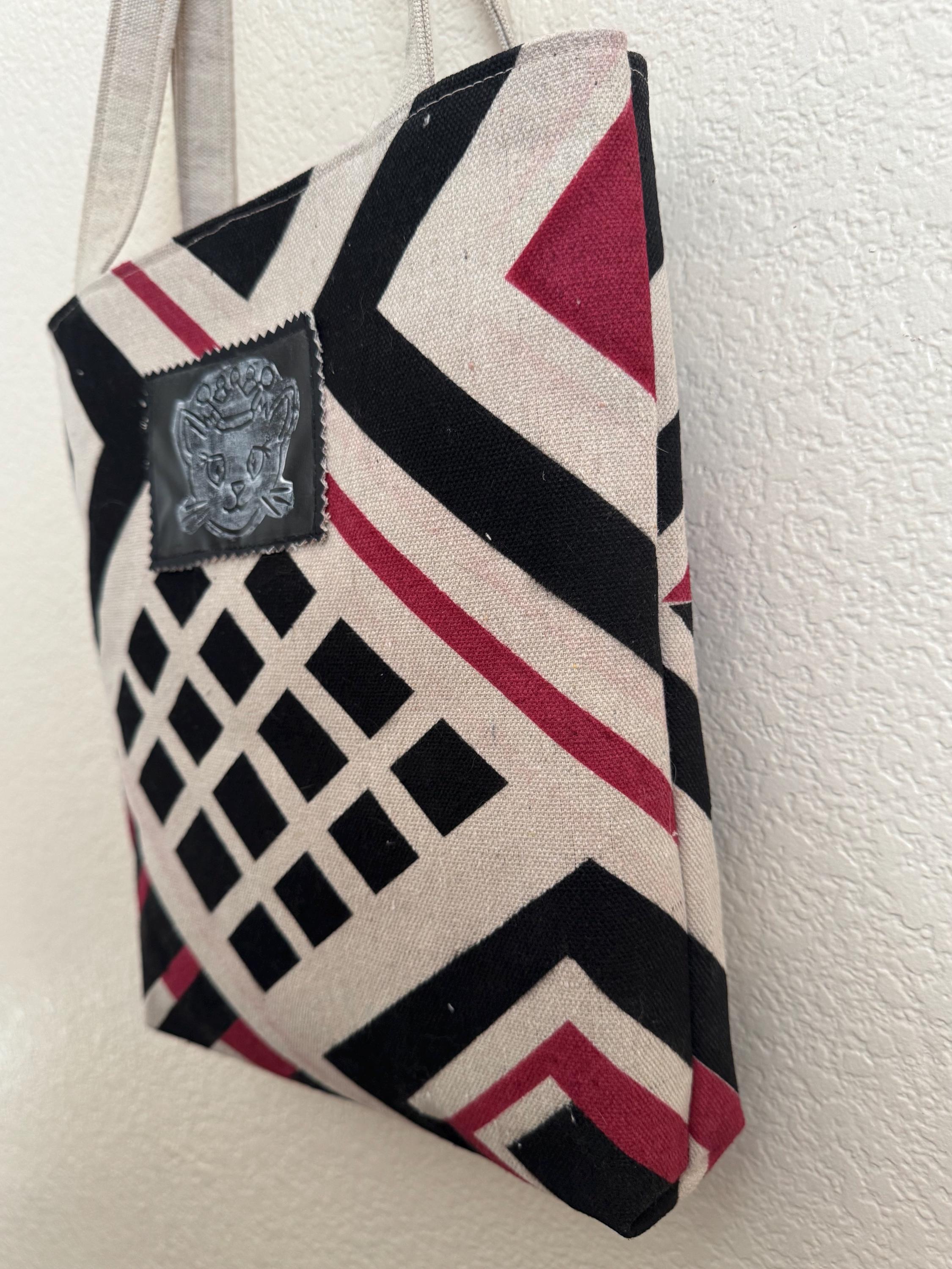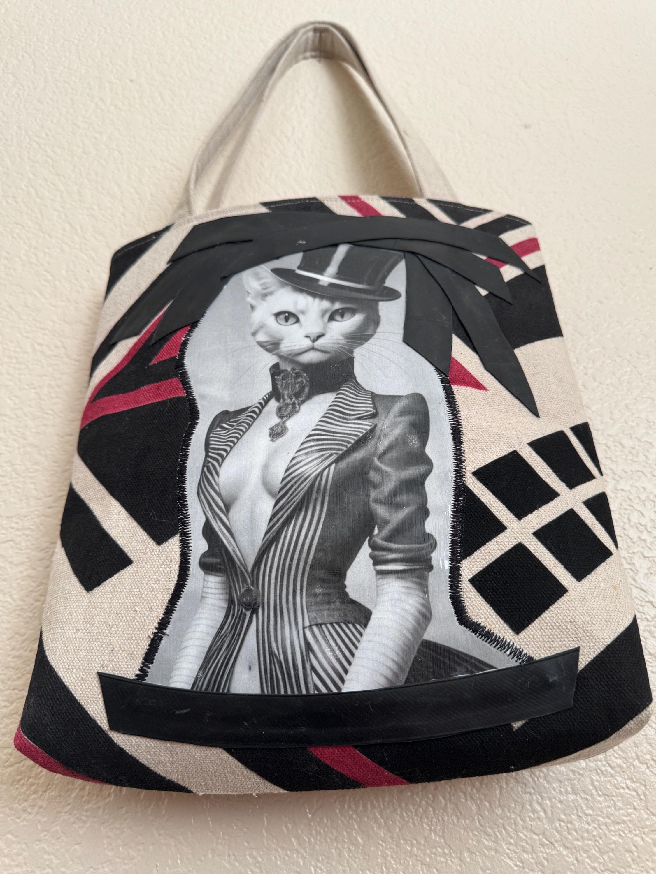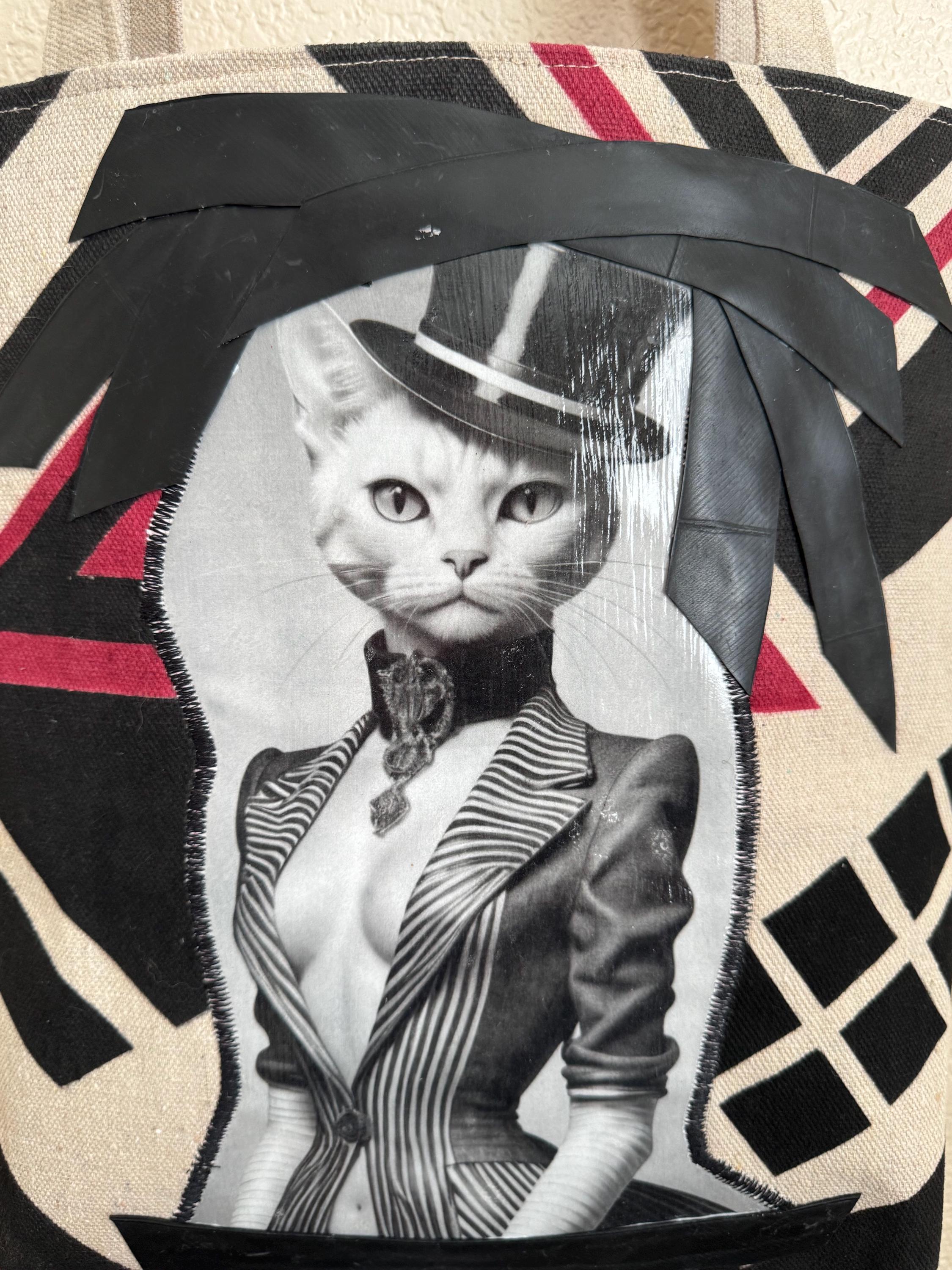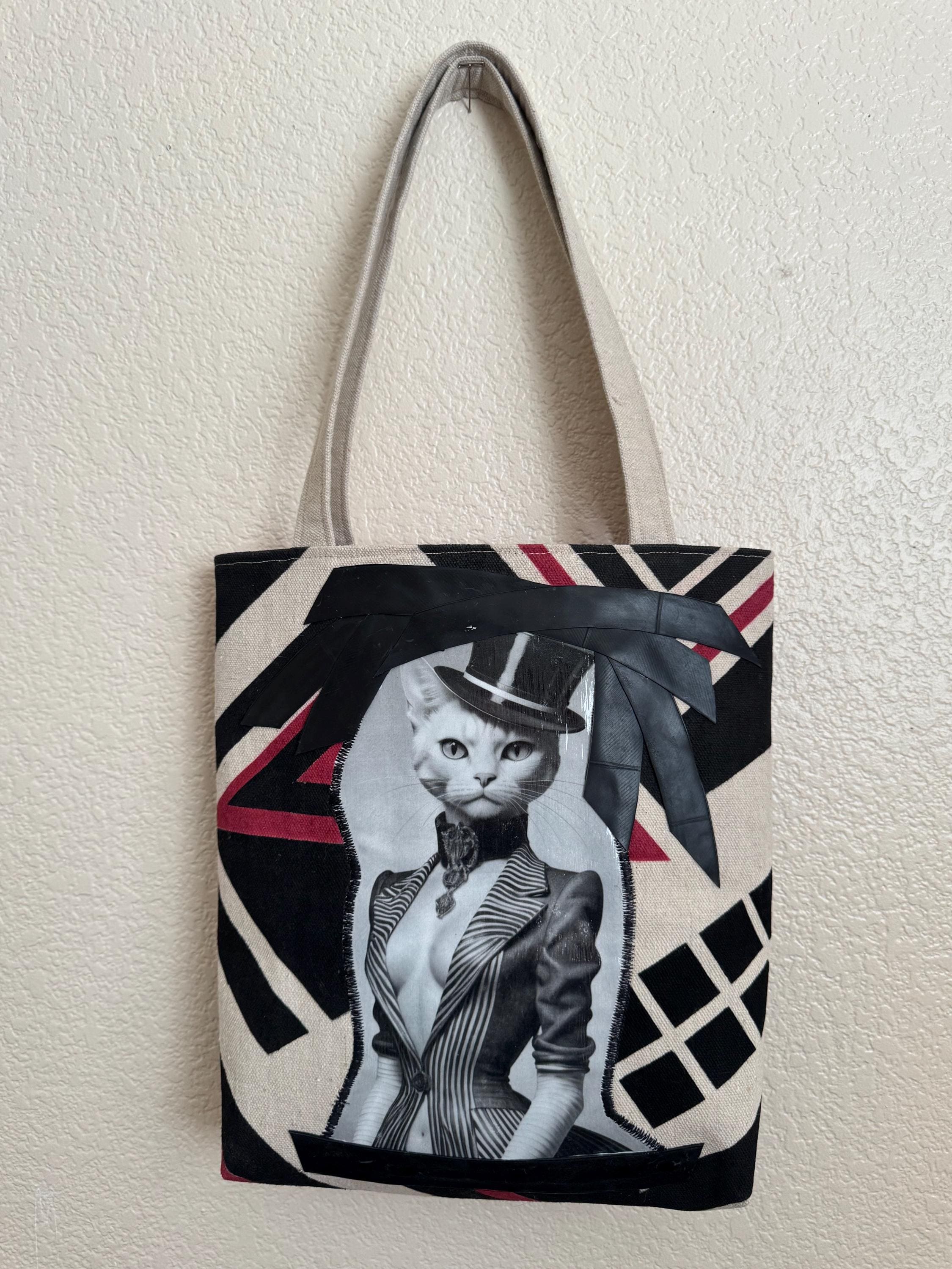 Upcycled Catastic Tote 2 This is a fun simple tote like purse with a magnetic snap and interior pocket. The straps are a great length and width for easy and comfortable carrying. This bag is one of a kind. Each bag is handpainted with upcycled materials, original designs and accented with Original AI Generated Art work to add some flare. These bags are not only unique they are also eco friendly and you will be the only one on the block with this exact design! Each bag is stamped and dated.